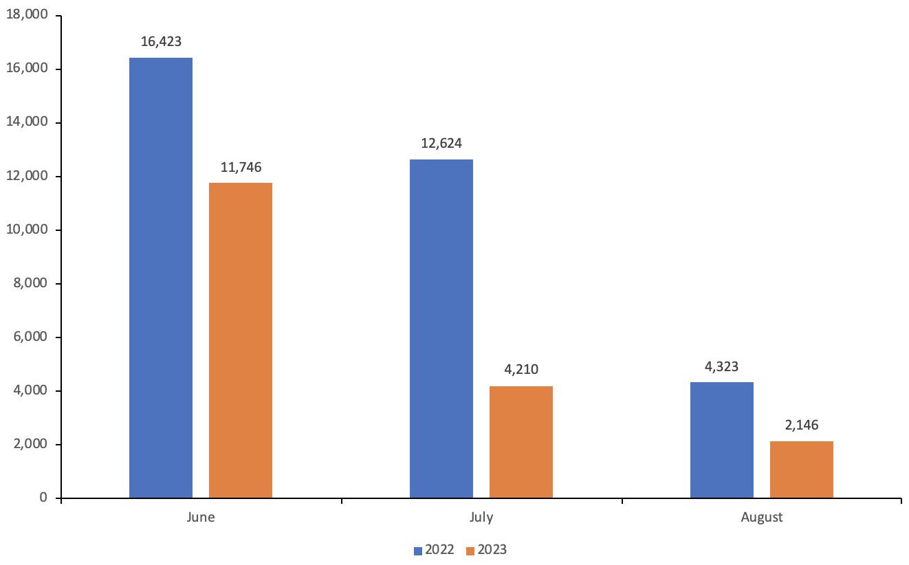 The reader will notice in both summers that the number of visas issued dropped from June to July and again from July to August; this is normal for the program and relates to nothing more than the routine decision-making and agency timing at USCIS. What is significant is the month-to-month comparisons for the two summers: e.g., June 2022 vs. June 2023.